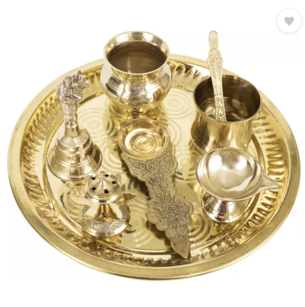 Putrika Traditional Handcrafted Brass Thali/Aarti Bartan Plate for Pooja/Worship Brass (8 Pieces, Gold)