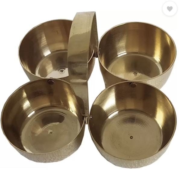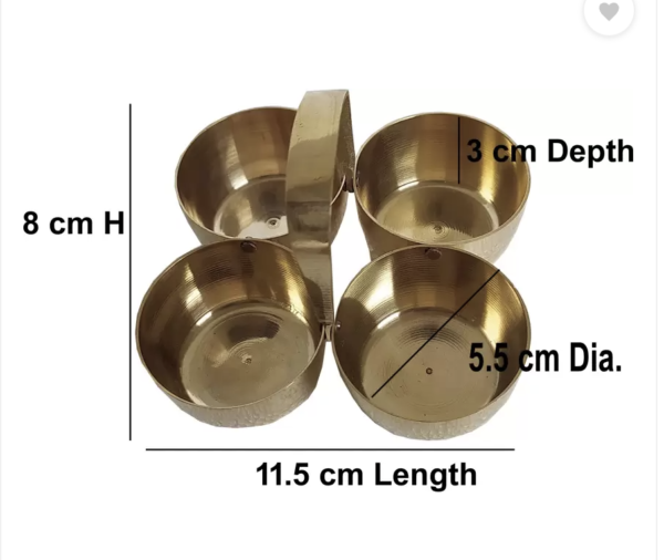 Chowmukh Haldi Kumkum , roli chawal, elaichi mishri brass bowl is a Four Container bowl Holder. This brass bowl Can be used for Worship at home/Temple/office, also an ideal gift for your loved ones.It ensures durability and is easy to clean. Grab one for yourself or your nears & dears. Brass 4 Katori In One For Pooja.This product adds elegance to your home decor. Add an element of spirituality to your home decor. It can also be an ideal addition to your pooja room. It could be a great gifting option for religious celebrations or festivals. Artisan crafts made by traditional sand casting methods by Moradabad artisans in North India.